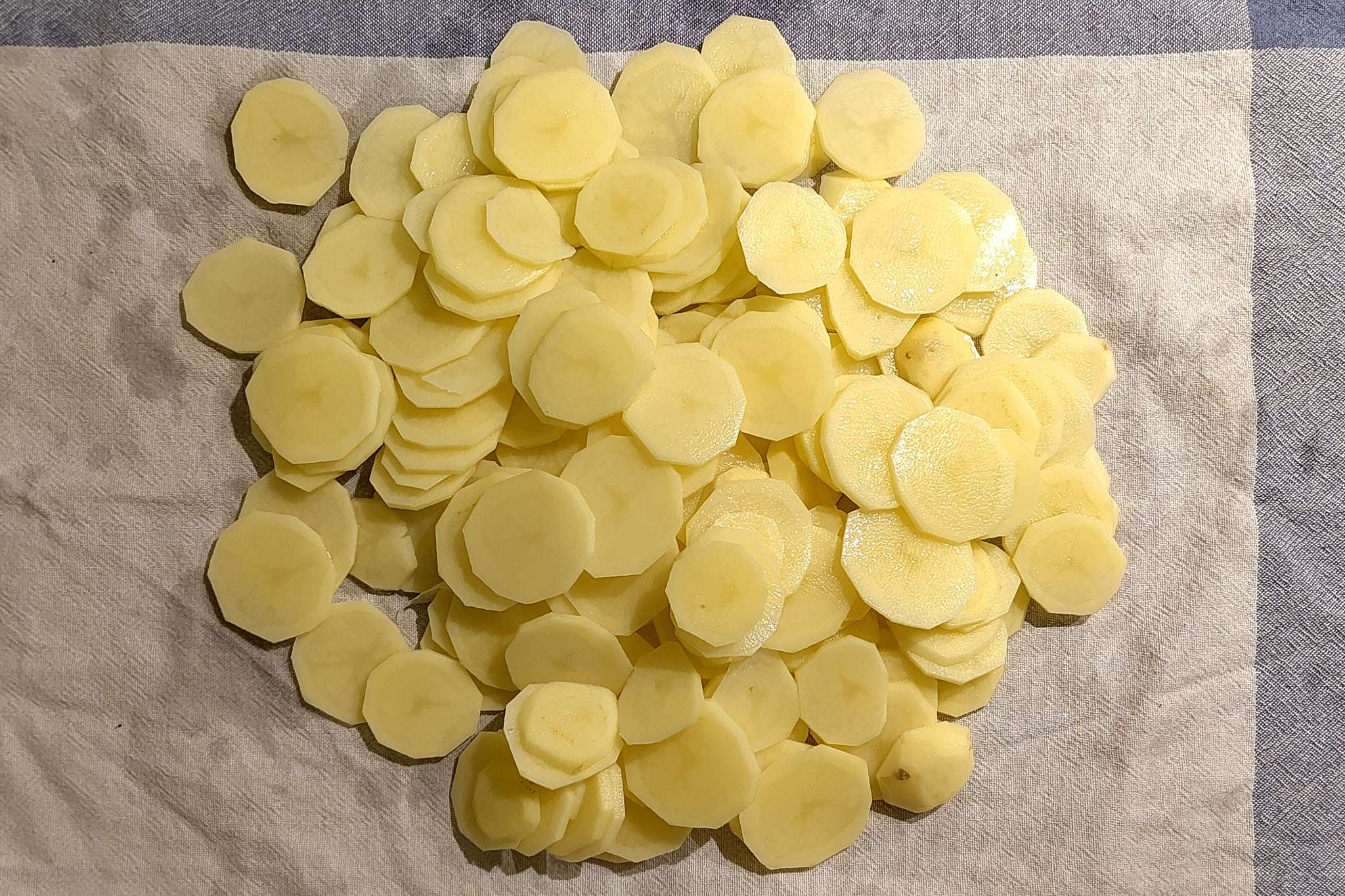 Épluchez et coupez en rondelles de 2 mm d’épaisseur — la mandoline est idéale, le couteau fonctionne très bien aussi. En dessous de 2 mm, elles risquent de se transformer en purée. Au-dessus, on perd le côté feuilleté et fondant qui fait tout le charme de la tortilla.
