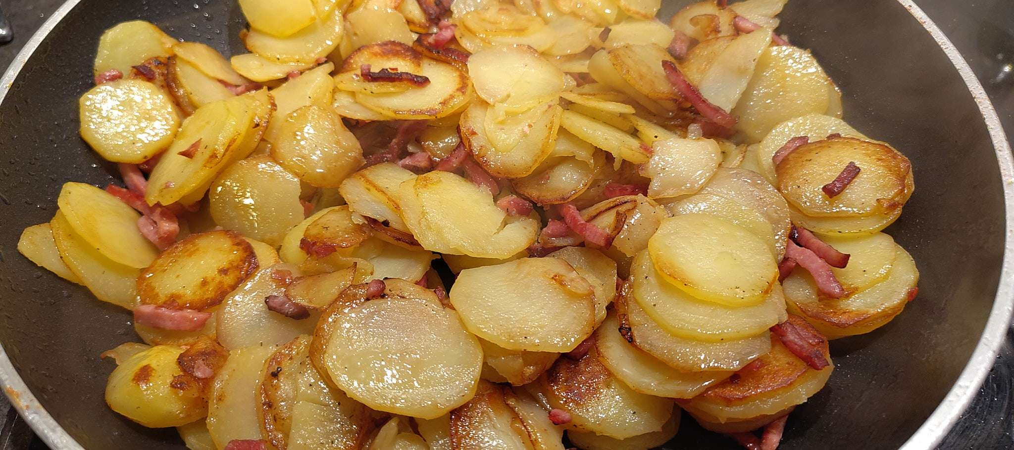 Quand les pommes de terre commencent à dorer, vous pouvez ajouter lardons, allumettes ou chorizo en petits dés. L’ail également — pas avant, sinon il brûle. Laissez dorer jusqu’à obtenir ce petit goût de chips.